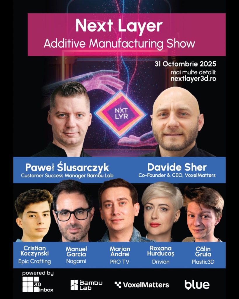 Organizat de compania 3dinbox.ro, cu sprijinul partenerului media VoxelMatters și al partenerului de mobilitate Blue, evenimentul va prilejui participanților întâlnirea cu nume consacrate la nivel mondial, precum Davide Sher (Italia), Co-fondator și CEO al VoxelMatters, Paweł Ślusarczyk (Polonia), Bambu Lab sau Manuel Jiménez García (Spania), Co-fondator Nagami.