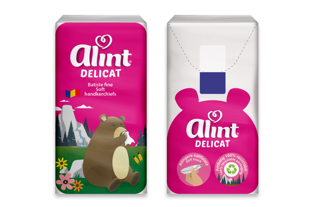 Ambalajele produselor au fost complet reconcepute și desenate de către Alex Ceauș, Graphic Designer și Brand Manager Sovio. Acestea au în centru imaginea ursului carpatin, simbol al forței, în contrast cu finețea hârtiei. „Pentru gama de produse Alint am dorit să aducem la raft un element puternic de diferențiere. Ursul carpatin este un simbol național, dar noi am ales să-l exprimăm într-o manieră jucăușă și prietenoasă, care reflectă atât calitatea produselor, cât și apropierea de consumatorii români”, explică Alex Ceauș.