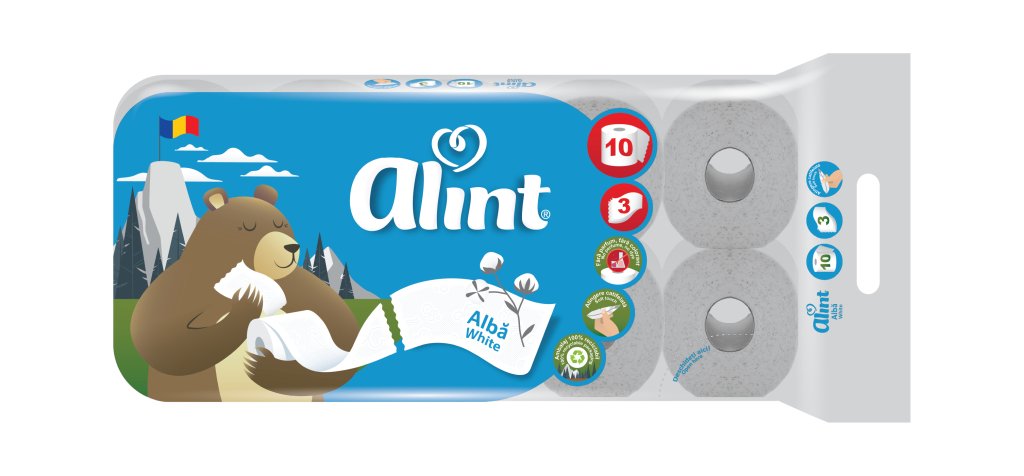 Relansarea brandului românesc aduce și inovații în portofoliu, precum monorola Alint Practic (50 m) și hârtia igienică Alint cu parfum de piersică, disponibilă în pachete de 10 role.