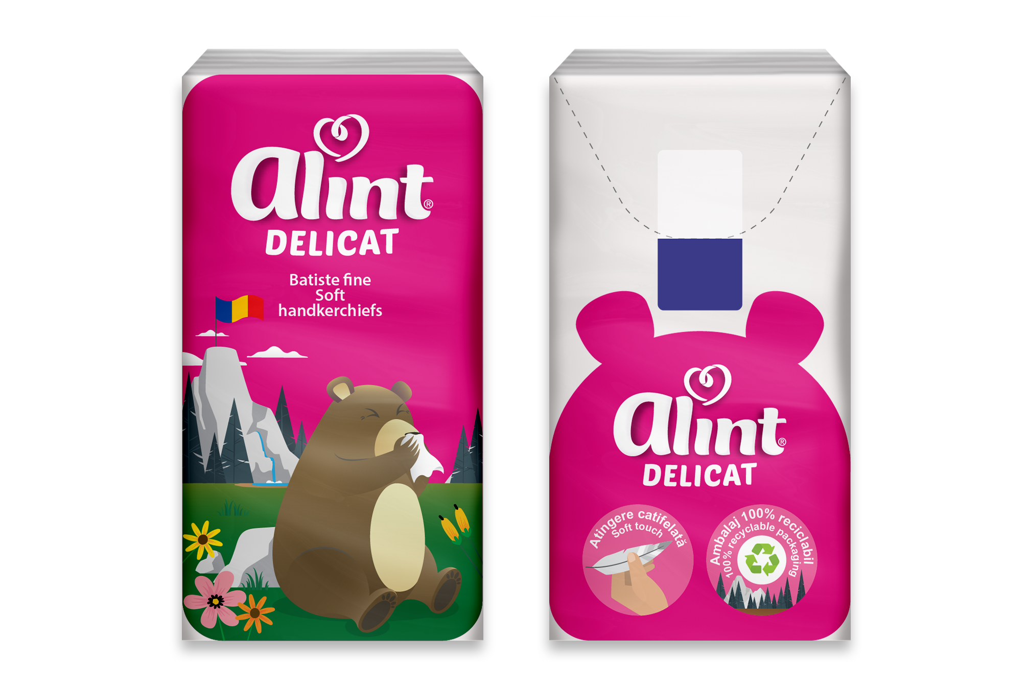 Ambalajele produselor au fost complet reconcepute și desenate de către Alex Ceauș, Graphic Designer și Brand Manager Sovio. Acestea au în centru imaginea ursului carpatin, simbol al forței, în contrast cu finețea hârtiei. „Pentru gama de produse Alint am dorit să aducem la raft un element puternic de diferențiere. Ursul carpatin este un simbol național, dar noi am ales să-l exprimăm într-o manieră jucăușă și prietenoasă, care reflectă atât calitatea produselor, cât și apropierea de consumatorii români”, explică Alex Ceauș.