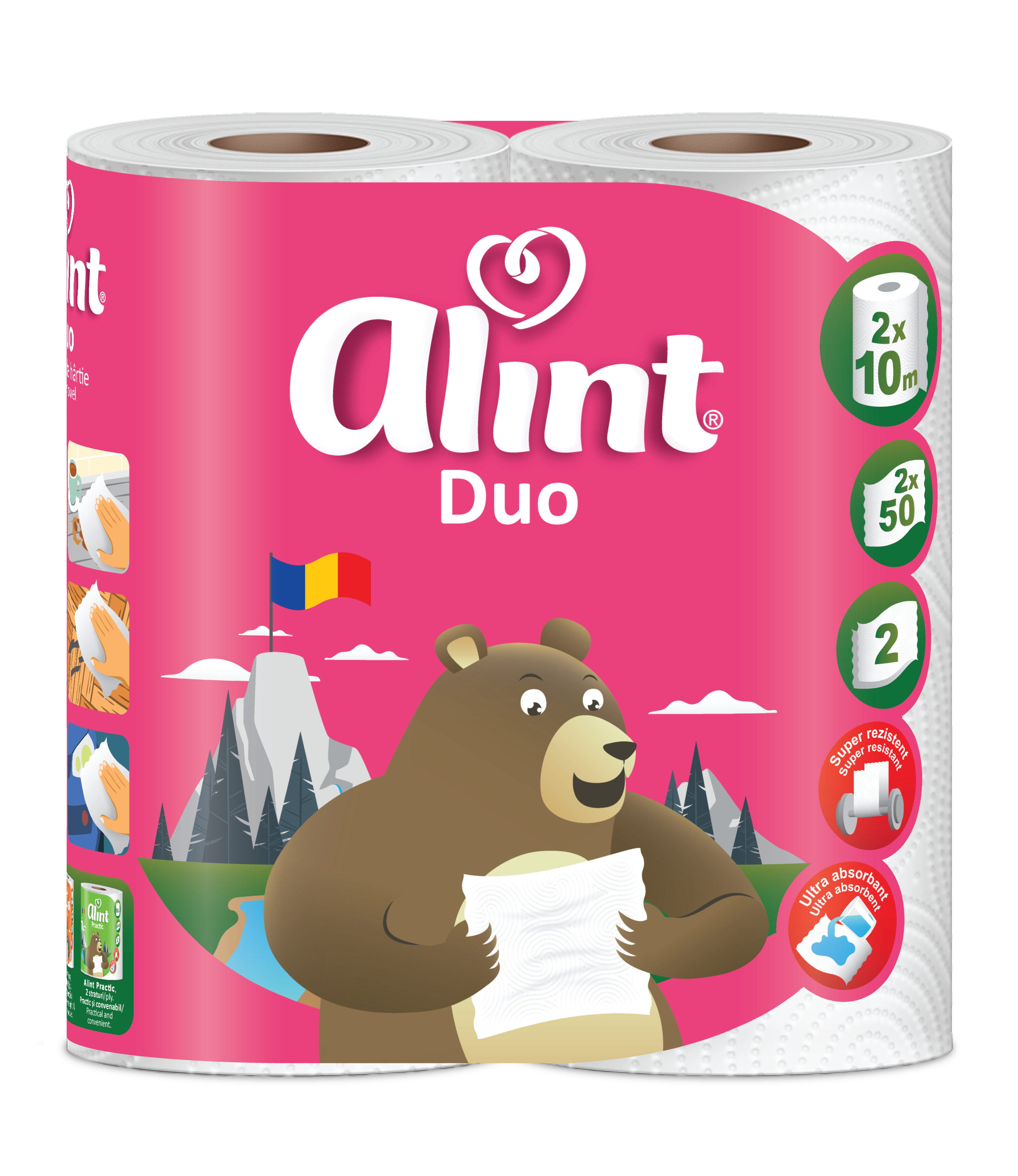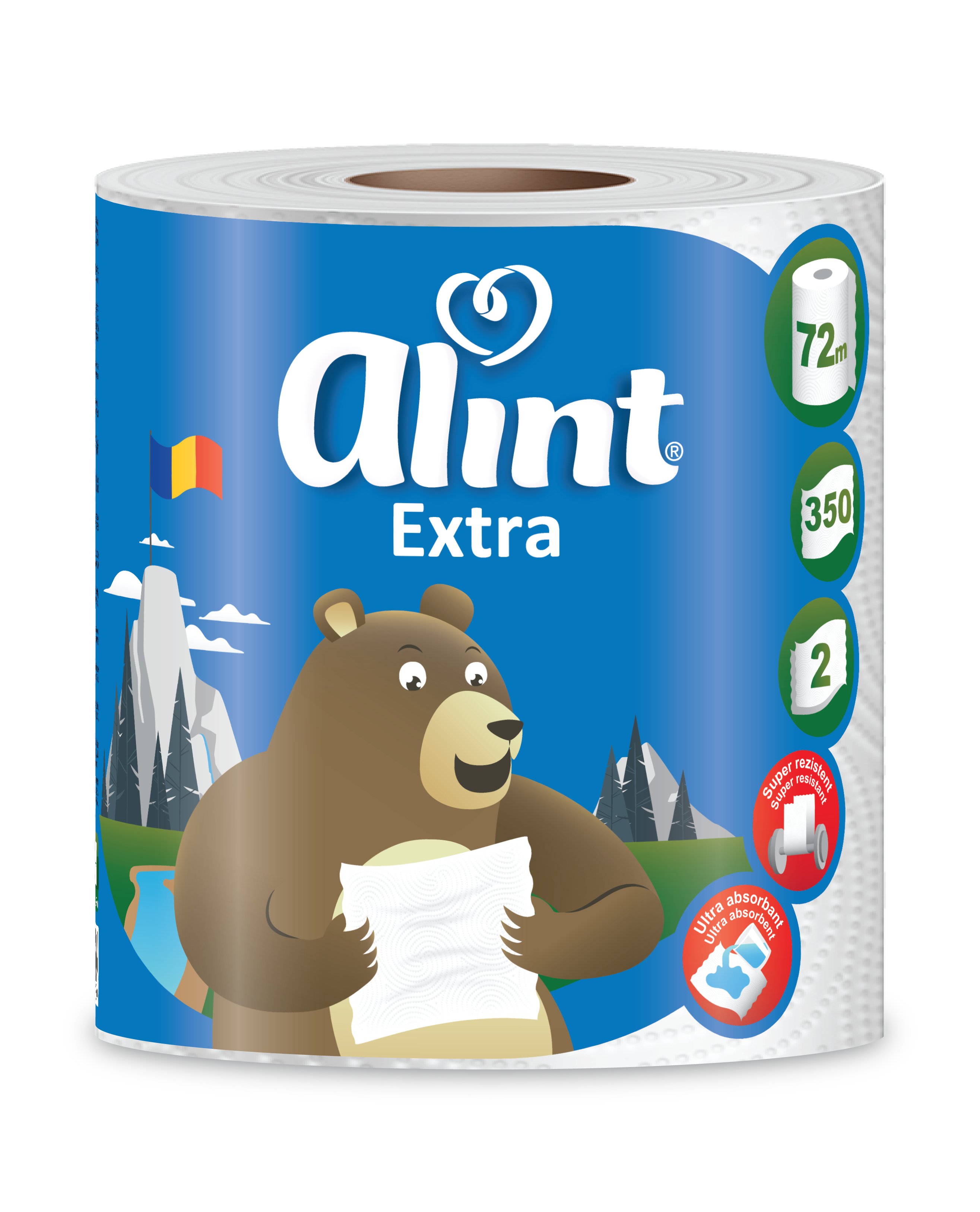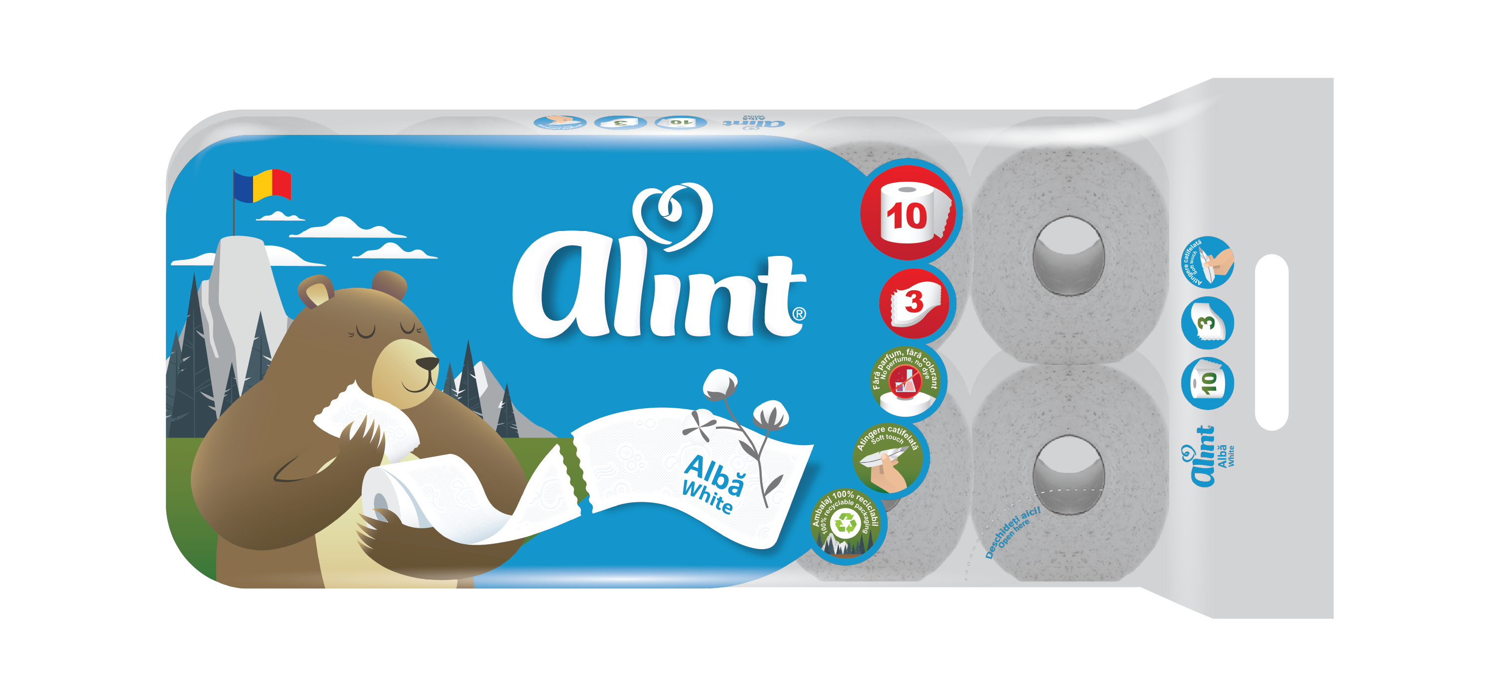Relansarea brandului românesc aduce și inovații în portofoliu, precum monorola Alint Practic (50 m) și hârtia igienică Alint cu parfum de piersică, disponibilă în pachete de 10 role.